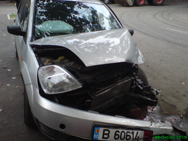 Azi, pe la 11:30, in fata ambasadei Poloniei, un coleg de serviciu conducand un Ford Fiesta (pe care il mai conduceam si eu din cand in cand), a avut ghinionul de a-si intersecta drumul cu un excavator, ce nu i-a acordat prioritate. Rezultatul se poate vedea in poze (facute cu telefonul din pacate). El nu are nimic, dar masina e varza. Ce m-a intrigat a fost ca airbag-urile s-au deschis, desi el NU purta centura de siguranta (si nici nu era trasa prin spatele scaunului). Masina a fost proiectata intr-o Dacie, care a ajuns in mijocul drumului, dupa ce a atins putin o Solenza (in poza in care apare, Dacia fusese deja mutata din drum)