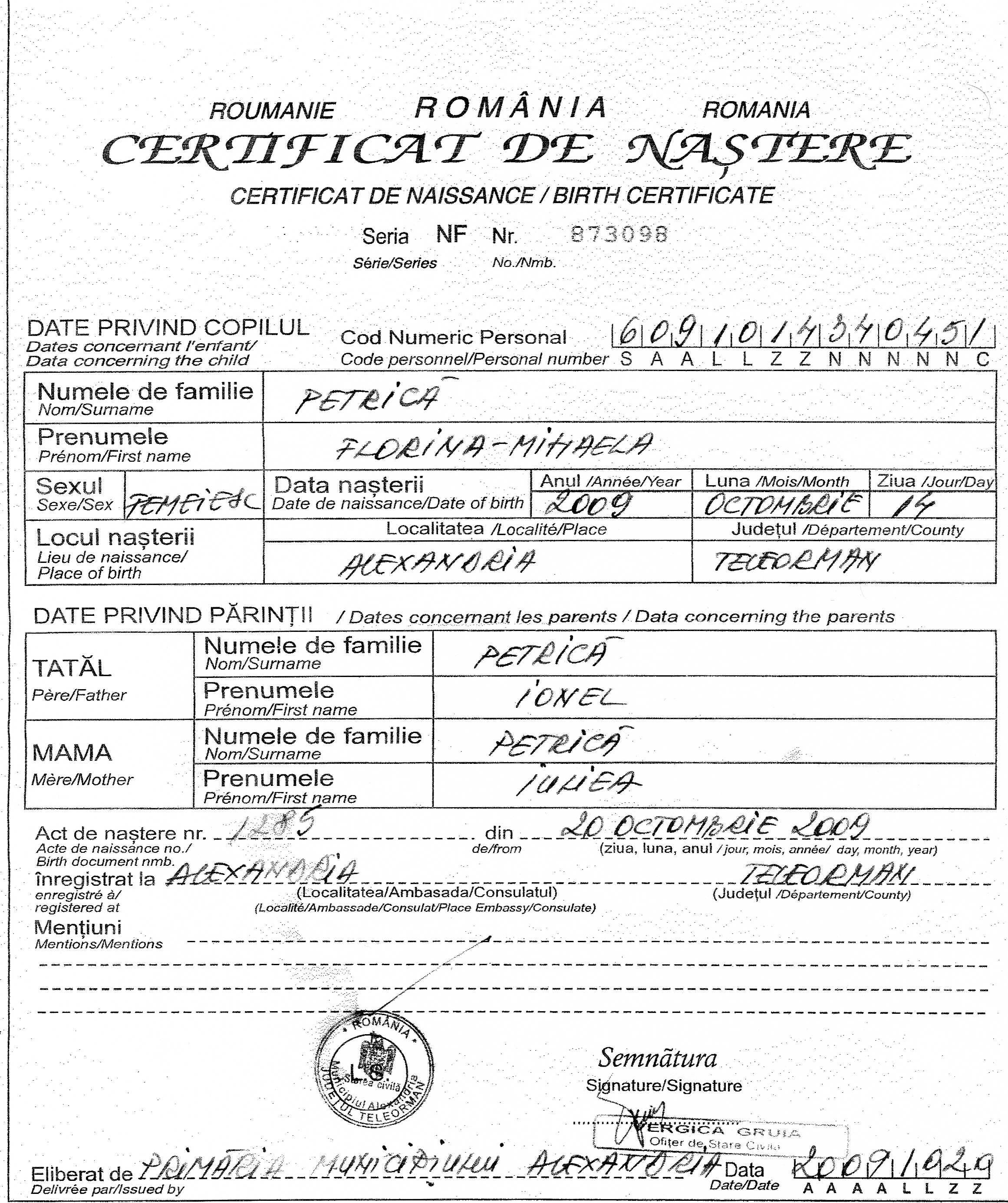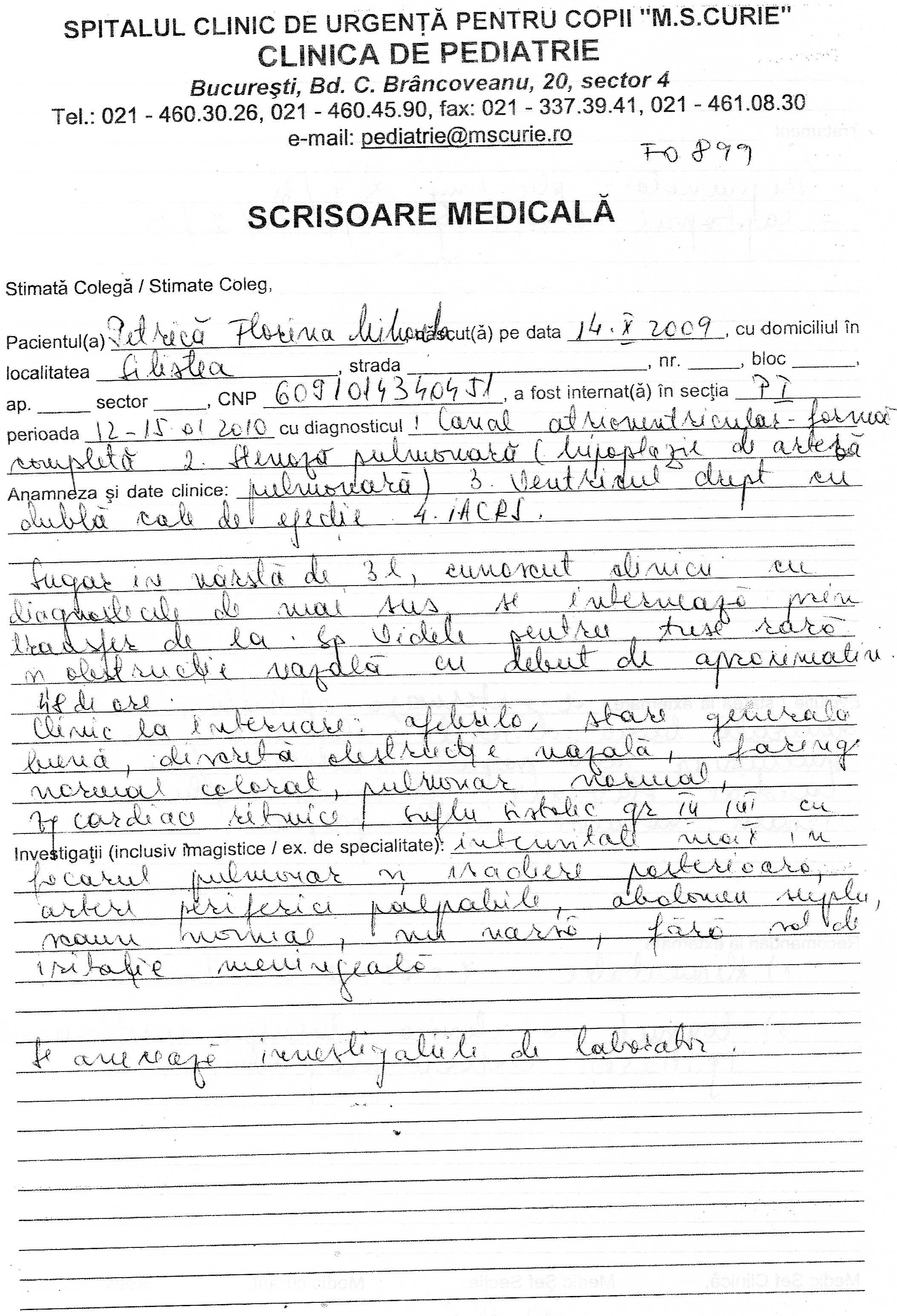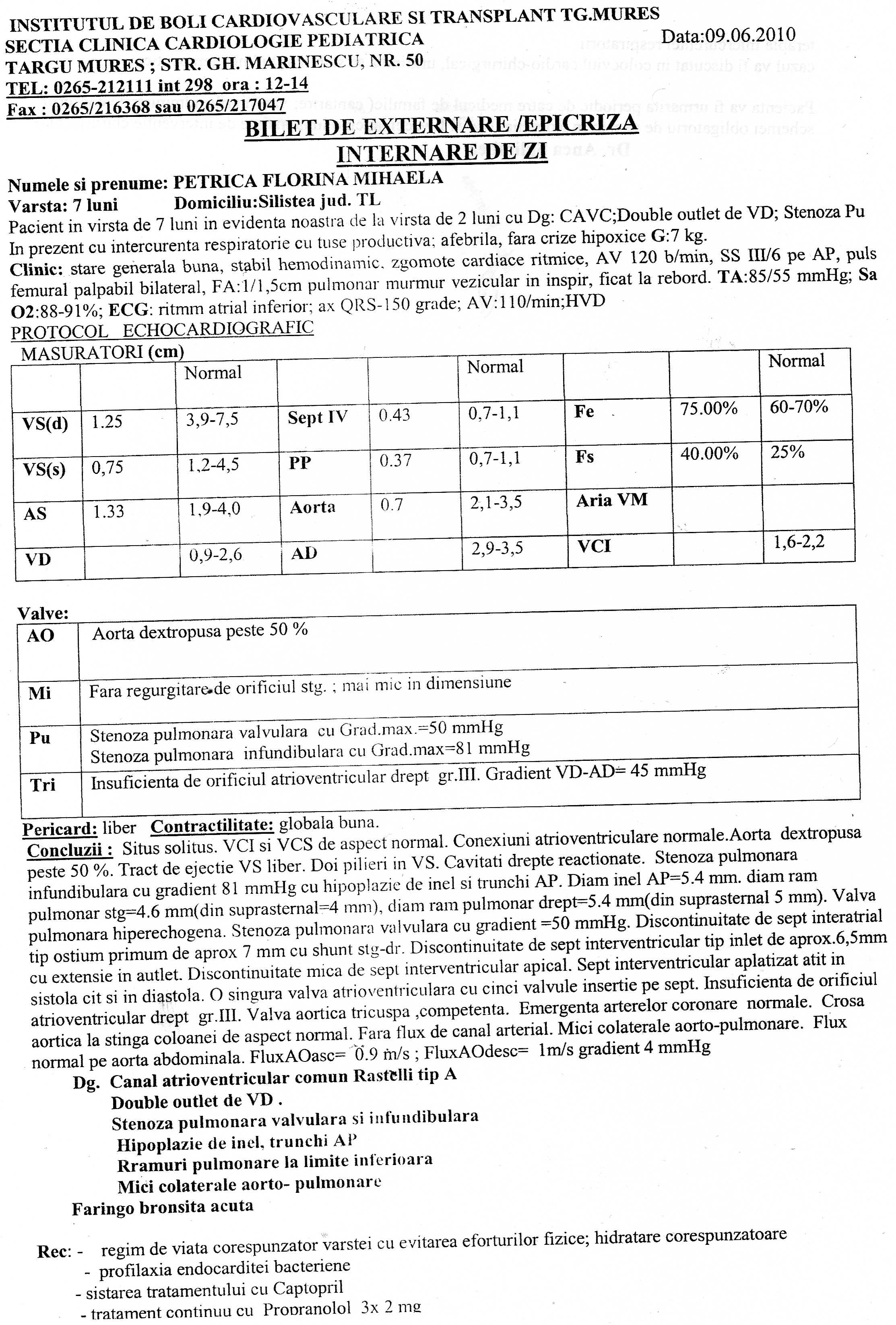 1. Buna, Ma numesc Petrica Florina Mihaela din Com. Silistea. Jud. Teleorman. Mama m-a nascut cu greu s-a chinuit mult cu mine deoarece de cand am primit viata ma lupt sa traiesc cu diagnosticile date de medici : 1. CANAL ATRIOVENTRICULAR COMUN RASTELLI TIP A 2.DOUBLE OUTLET VD 3. STENOZA PULMONARA VALVULARA SI INFUNDIBULARA 3. IPOPLAZIE DE INEL, TRUNCHI AP 4. RAMURI PULMONARE LA LIMITE INFERIOARE 5. MICI COLATERALE AORTO-PULMONARE 6. FARINGO BRONSITA ACUTA M-am luptat pana acum cu aceasta boala , mama mea este neputincioasa si din punct de vedere financiar si fizic .Daca ea ar putea mi-ar da inima ei sa traiesc eu .Medici mi-au spus ca trebuie sa ma operez pe cord deschis in doua etape .Dar aici la Tg. Mures nu este posibil deoarece riscurile sunt prea mari iar eu prea micuta sa suport operatia aici . Mi s-a recomandat sa fac operatia la o clinica din Germania unde desigur am mai multe sanse de a supravietui , mamica mea ar dori sa ma insoteasca , oricum fara ea nu pot pleca.Dar pentru asta apelez la voi oamenii cu SUFLETUL MARE si cu posibilitati financiare sa o ajutati pe mama mea sa mearga cu mine. Situatia noastra financiara este teribila , taticul meu primind doar alocatia de post-natal care desigur se duce pe medicamentele mele , alimentatia si vizita medicala necesara in orice moment . De un an de zile mamica si taticul meu incearca sa-mi stranga bani pentru operatie dar nu au reusit deoarece ea costa 50.000 de euro . Cu respect si speranta , Petrica Florina Mihaela Mamica: Iuliea Petrica Taticul: Ionel Petrica Telefon Info : 0786535797 0728811357 Cont Raiffeisen Bank : RO84R2BR0000060006285839 RON Avem si un link de download a unui filmulet Prin care va putem demonstra puteti suna ... uitati link de unde se poate downloada filmuletul http://www.dump.ro/video/pentru-mihaela-mpg1-352x240-29970fps-1120000bps-a1-d0-c80-10-mpg/33076 Nu stiu daca as putea sa atasez toate cele 20 de poze cu copy de la acte dar o sa incerc sa atasez cateva in video nu cred ca se vede prea clar ... Atatea au incaput . Daca am deranjat pe cineva cu ceva sa mi spuna dar mai intai ascultati si povestea acestei fetite de 1 an si cateva luni ...
