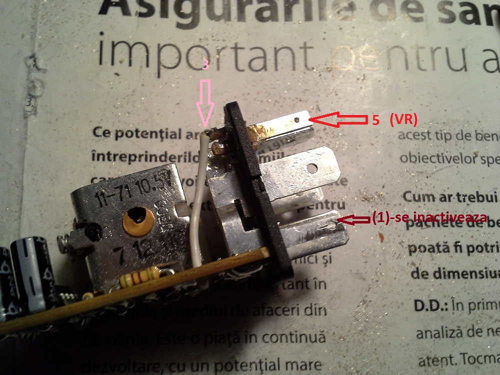 COMPLETARE: La metoda "A)" se poate renunta la demontarea fetei cu butoane a tabloului de bord. Operatiunile aferente punctului "f" pot fi inlocuite cu o interventie numai in releu, in sensul ca rezistorul de 100 - 150k destinat suntarii butonului de reglare, se poate monta chiar in releu prin lipirea intre pinii "1" (cel care a fost dezactivat prin intreruperea circuitului PCB) si, "proaspatul" montat, pinul "VR". Intrucat eu am inlocuit potentiometrul (precum am scris), nu am observat imediat evidenta acestei metode mult mai simple. OBS: Am preferat inlocuirea intregului potentiometru nu doar pentru a alege o cale mai dificila ci pentru a pastra variatia liniara a reglajului acestui rezistor (prin suntare se obtine o variatie neliniara, in maniera celei logaritmice dar, este mult mai simplu). -