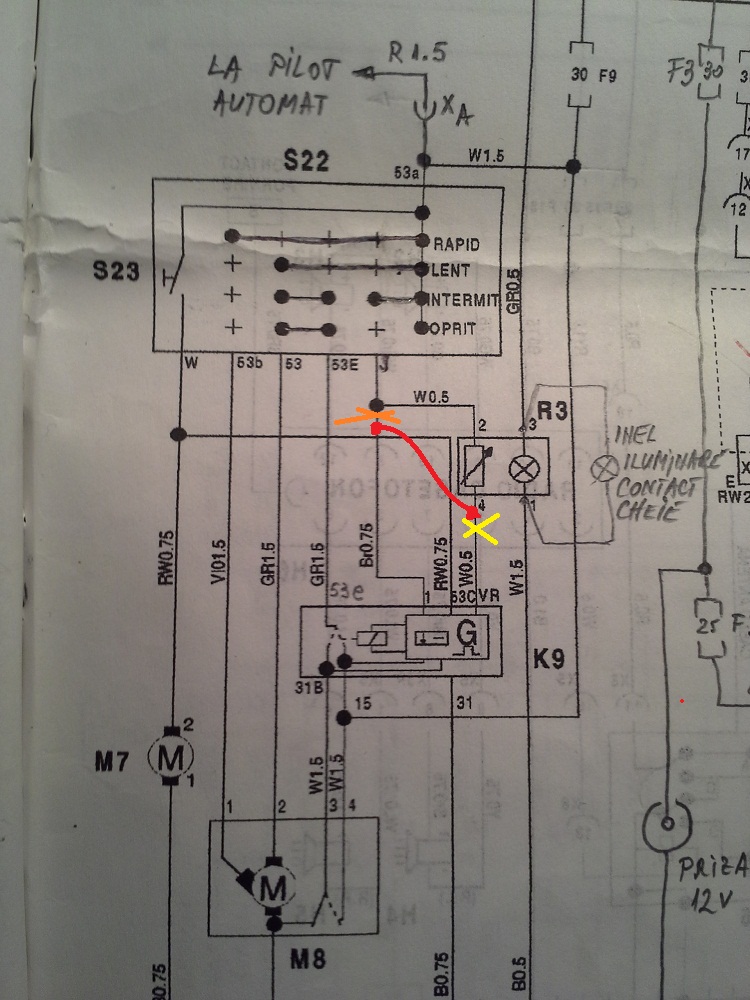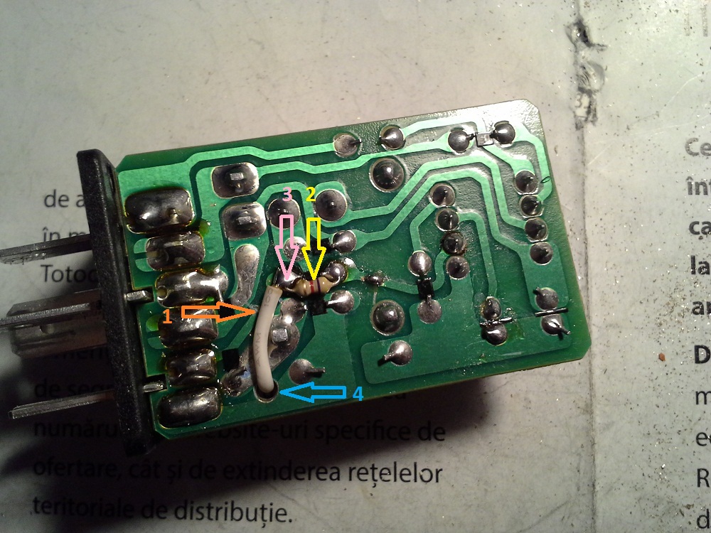 Intrucat am avut timp si nu am mai avut rabdare sa astept tutorialul colegului @cris06 (caruia ii multumesc pentru ca mi-a dezvaluit acest releu cu U641B, de a carui existenta nu aveam habar), satul de "cantecul" sumbru al releului original, am achizitionat un 96312300 (de la un Spark = 10 lei). A) L-am adaptat in urmatorul mod (care permite interschimbabilitatea cu cel original): a - l-am decapsulat, am confectionat si montat, pe noul releu, pinul "VR" (lipseste din constructie) b - am intrerupt circuitul in punctul marcat cu sageata 1 (inactivand astfel pinul releului marcat cu 1); c - am suntat rezistorul cu valoarea de 8k2 (greu de inlocuit fiindca se afla sub releu) cu unul de 4k7 obtinand astfel valoarea de 2k9, indicat de sageata 2; d - prin gaura de 2mm practicata in PCB (sageata 4) am trecut un conductor (vizibil, alb la culoare) pe care l-am lipit in nodul marcat cu sageata 3 (partea functionala ramasa dupa separarea pinului 1 - a se vedea a 2-a operatiune); e - lipit acest fir (alb) la pinul "VR" care a fost montat la prima operatiune (vezi sageata 5); f - dupa ce se demonteaza fata tabloului de bord, se sunteaza potentiometrul continut in butonul (original) pentru reglarea temporizarii (are valoarea de 100k, prea mare in aceasta aplicatie) cu un rezistor de cca. 150k (nu detaliez fiindca este simplu; se poate sunta in interior sau in exterior, dupa preferinta). Eu am modificat butonul in sensul ca am schimbat potentiometrul cu unul de 50k, treaba mai laborioasa si migaloasa). B) Pentru cine doreste sa scape de migaleala montarii pinului "VR" si nu doreste interschimbabilitatea cu vechiul releu, se poate mai simplu: *) se practica numai operatiile de la punctele "c" si "f"; **) se taie firul maro (subtire) care este conectat impreuna cu firul alb - tot subtire (vine de la butonul pt. reglarea temporizarii) la papucul "1" al comutatorului stergatoarelor; se lasa o bucata de cca. 30mm de la papuc (ca masura de prevedere pentru o eventuala refacere a vechii instalatii); ***) se taie firul alb (cel care pleaca de la conectorul butonului de reglare la papucul "VR" din panoul cu sigurante si relee (deci, care este perechea celui netaiat mentionat mai sus); se lasa o bucata de cca. 30mm de la conectorul butonului; ****) se conecteaza bucata de fir alb mentionata imediat mai sus cu partea ramasa a firului maro (cea care duce la papucul "1" al soclului releului in tabloul cu sigurante si relee (asa cum se observa desenat cu rosu in schema electrica); se izoleaza. In conditiile efectuarii operatiunilor de mai sus se obtine o functionare foarte linistita a instalatiei de stergere-spalare parbriz, cu timpi de pauza la pozitia de functionare intermitenta, situati intre 2 si 15 sec. Dupa oprirea actionarii manetei pentru spalare (din pozitia "oprit"), deci dupa terminarea stropirii, stergatoarele fac 2 curse. -