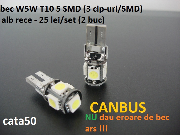 Stoc nou: -Bec alb rece W5W/T10 led 5 SMD hiperluminoase (lumineaza cat 15 SMD normale) - 20 lei/set(2 becuri) -Bec alb rece W5W/T10 led 5 SMD hiperluminoase (lumineaza cat 15 SMD normale) CANBUS - 25 lei/set(2 becuri) -Bec alb rece W5W/T10 led 10 SMD - 25 lei/set(2 becuri) -Bec alb rece C5W sofit led 3 SMD hiperluminoase (lumineaza cat 10 SMD normale) - 20 lei/set(2 becuri) -Bec alb rece C5W sofit led 3 SMD hiperluminoase (lumineaza cat 10 SMD normale) +radiator de racire din aluminiu CANBUS