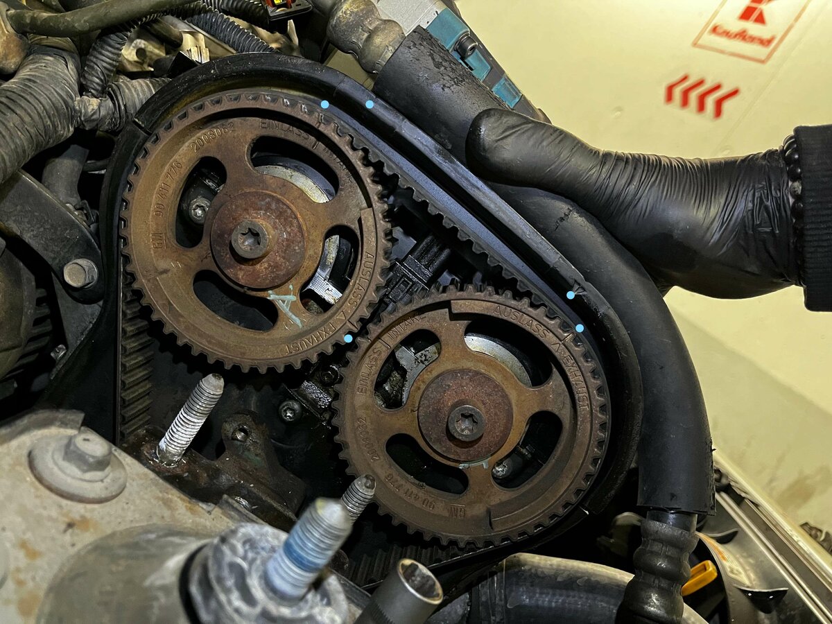 Vezi poza mai jos. am pus buline pt a se vedea mai bine 🙂 P.S. A se observa ca rotile dintate de la axe sunt la fel (par amandoua de evacuare) cea de admisie are gaurile mai mici si mai dese