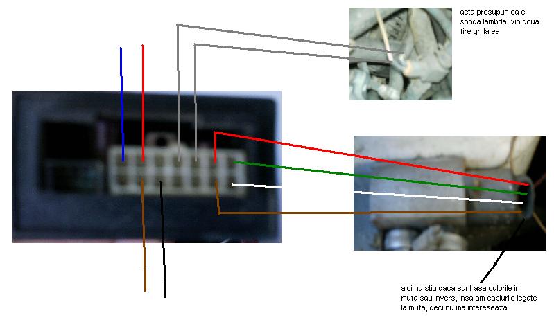Kinetix Posted October 18, 2008 Share Posted October 18, 2008 Salutare. Pai ai cam asa: - un fir la plus (+) - un fir la minus (masa, -) - patru fire la sonda lambda (doua albe, unul gri si unul negru) - patru fire la electrovalva de ralanti (I.A.C= Idle Air Control, chestia aia neagra ca un motoras care sta prinsa in fata amortizorului din dreapta) - doua fire albe la senzorul de temperatura de pe circuitul de incalzire a termoelementului socului automat (de obicei aceste doua fire sunt anulate...) Mult succes! Link to comment