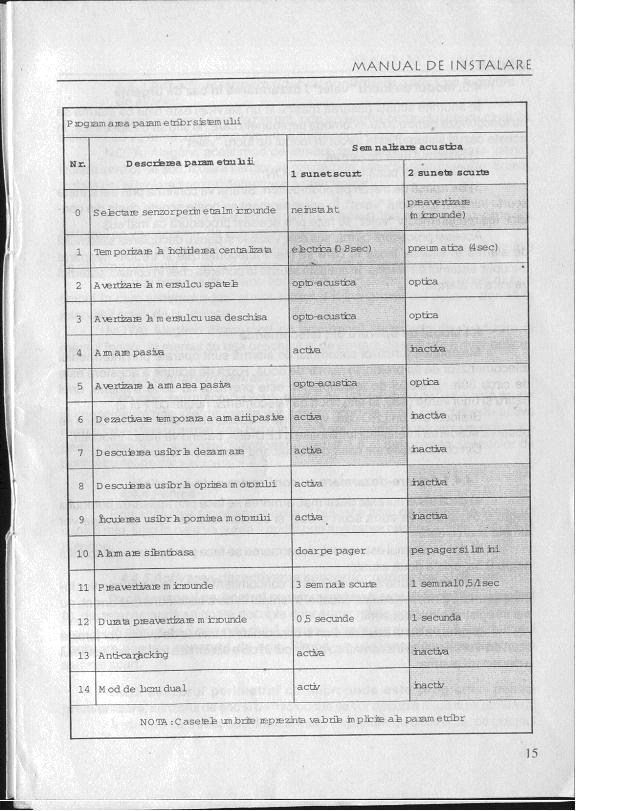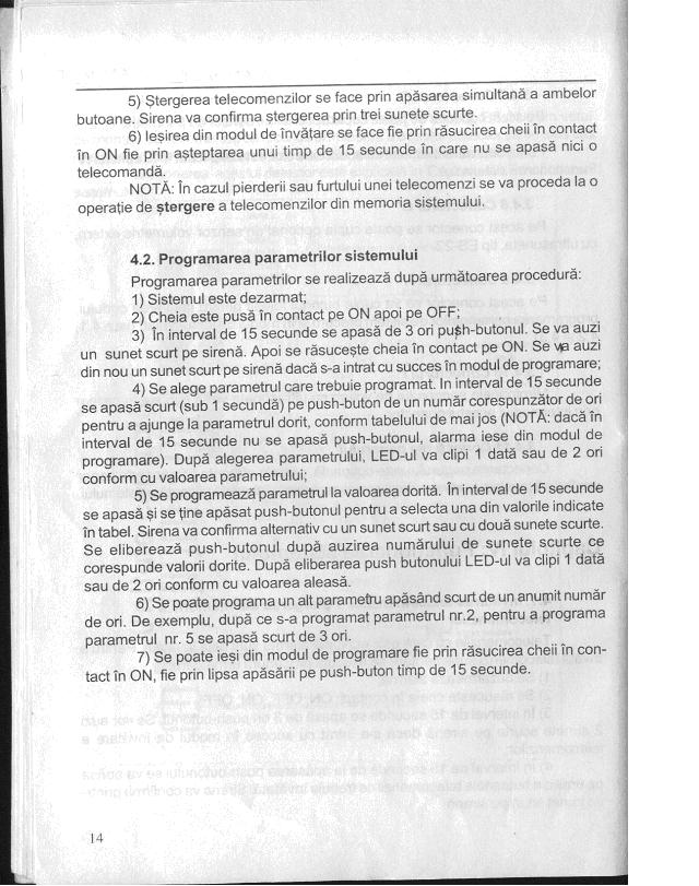 nicu_gab Posted March 4, 2009 Share Posted March 4, 2009 Merci de linkuri! Am cautat de am innebunit, am gasit doar manual de instalare si manual de utilizare, dar nu gasesc ceea ce imi trebuie "manual de programare" Daca ma puteti ajuta, sa imi spuneti cum sa-i scot avertizarea sonora ca ma injura toti vecinii cand plec dimineatza. si mai am o problema cu armarea automata ...dupa ce o dezactivez daca nu deschid nici o usa in nustiu cate secunde se armeaza singura...Va rog mult daca stiti ajutatima! Merci! cu respect! Link to comment