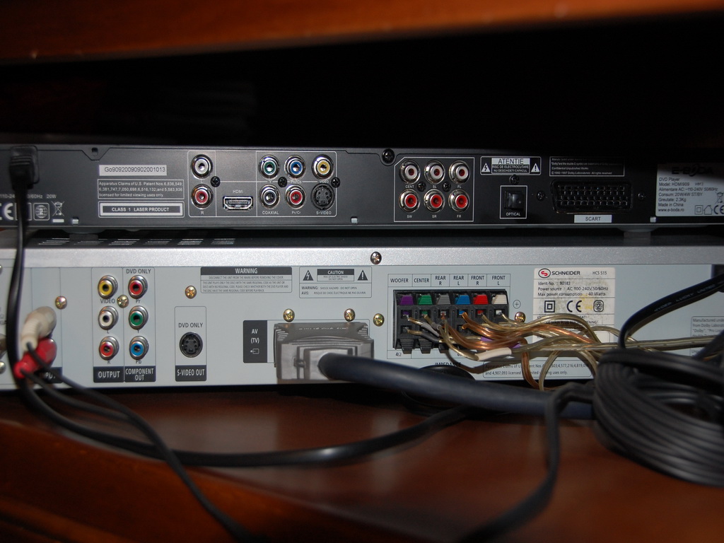 NFS Posted March 8, 2011 Share Posted March 8, 2011 Am 2 dvd-playere. Cel de jos, o vechitura, e legat la TV prin mufa euroscart si la sistemul surround prin cele 12 cabluri care duc la boxe. Cablurile sunt trase prin pereti, treaba serioasa... Pe cel de sus (un Eboda) am reusit sa-l leg doar la TV prin cablul audio-video cu care a venit. Problema e ca sunetul se aude doar pe boxele TV-ului, normal. As vrea sa-l bag pe surround, dar n-am unde sa-i bag maţele alea multe. Stiti vreun adaptor care sa aibe jack-uri intr-o parte si sistemul ala cu clestisori in partea ailalta? Sau cum as putea sa fac? Sincer as prefera sa nu iau alte boxe, asta ar insemna sa trag firele prin casa si nu-mi convine. Link to comment